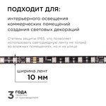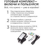 В состав готового комплекта цифровой ленты с артикулом 10-102 входит 10 метров светодиодной ленты, которая работает от постоянного тока с напряжением 24 В. Благодаря светодиодам smd 5050 излучающим световой поток равный 700 Лм/м* лента является прекрасным решением для организации основного освещения и ярких декоративных подсветок. Она подойдет для создания основного освещения на базе многоуровневых потолков, а также будет отличным выбором для освещения торгового оборудования или требующих большой яркости рекламных вывесок. По сравнению с лампами накаливания светодиодная лента эквивалентна лампам мощностью 70 Вт. Данная модель светодиодной ленты является многоцветной. Каждый светодиод такой ленты имеет 3 базовых цвета: синий, зеленый и красный. В зависимости от используемого контроллера можно получить до 256 различных оттенков свечения. Также в состав комплекта входит адаптер питания с проводом и вилкой в розетку с одной стороны и коннектором для подключения адресной светодиодной ленты, с другой стороны. Степень защиты светодиодной ленты соответствует стандарту IP65, что позволяет использование не только во влажных помещениях, но и на улице. Отрезать светодиодную ленту можно в специально отмеченных местах, которые располагаются через каждые 100 мм. Компактные размеры светодиодной ленты с шириной 10 мм и основанием из гибкой, двухслойной, медной подложки дают огромное преимущество при создании любых дизайнерских фантазий. В дополнение к вышеупомянутой информации добавим, что данный комплект уже содержит в своем составе RGB контроллер с пультом, передающим сигнал по радиоканалу, который работает на дистанции до 15 метров без надобности находиться в зоне прямой видимости.