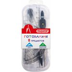 Металлическая готовальня ПИФАГОР предназначена для выполнения чертежных работ. Подойдет ученикам младших, средних и старших классов. В состав готовальни входят 8 предметов: