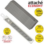 Лезвие сменное сегментированное Attache Economy стальное 9 мм прямоугольное (10 штук в упаковке)Сегментированные сменные лезвия предназначены для универсальных канцелярских ножей и подходят для аккуратной резки бумаги, упаковочной плёнки, конвертов и посылок. Они обеспечивают чистый и ровный срез, продлевая срок службы инструмента.Лезвия изготовлены из прочной стали, устойчивой к износу. Конструкция сегментированная - 13 рабочих сегментов позволяют быстро обновить режущую кромку без необходимости заточки. Прямоугольная форма с углом наклона 60° обеспечивает удобство и точность при работе.Ширина лезвия составляет 9 мм, толщина - 0.4 мм, длина - 80 мм. В комплект входит 10 лезвий, размещённых в пластиковом контейнере, который обеспечивает безопасное хранение и транспортировку.Во время работы рекомендуется использовать средства защиты, не утилизировать лезвия с бытовыми отходами и хранить их в недоступном для детей месте.