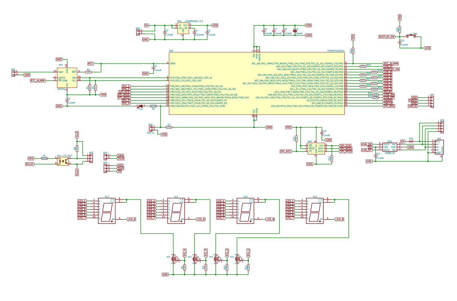 Таймер собран на микроконтроллере STM32F042K6T6 с аппаратным USB. В качестве часов реального времени используется микросхема DS3231SN+. Это сверхточные RTC с интерфейсом I2C, ТСХО и внутренним резонатором. Расписание работы таймера записывается и хранится в энергонезависимой памяти емкостью 64Кбит M95640-WMN6P. Порт USB защищён USBLC6. Индикация времени и режимов работы выведена на четыре семисегментных светодиодных индикатора в SMD корпусах и светодиод.