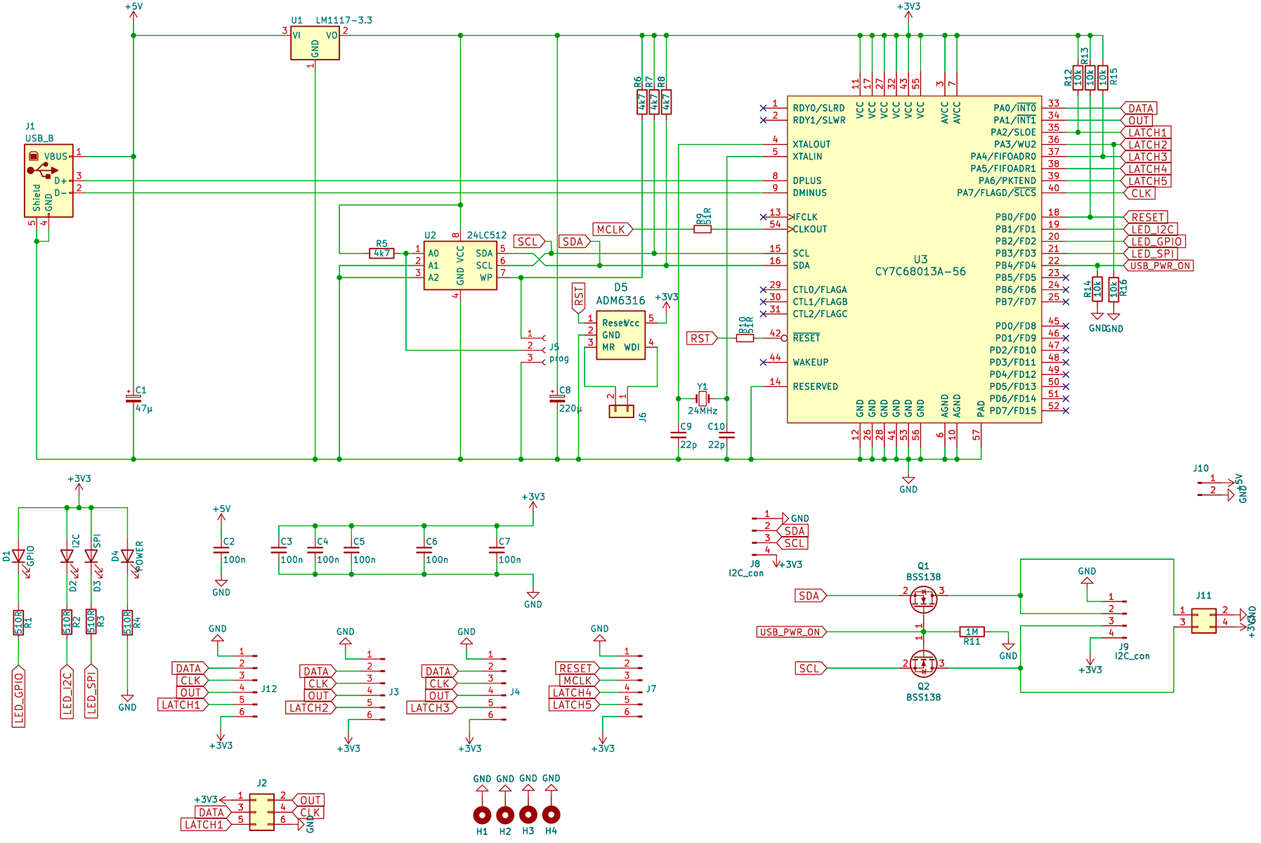 Модуль построен на микросхеме CY7C68013A это 8-битный микроконтроллер с ядром 8051 и без встроенной энергонезависимой памяти, поэтому программа загружается с внешней EEPROM