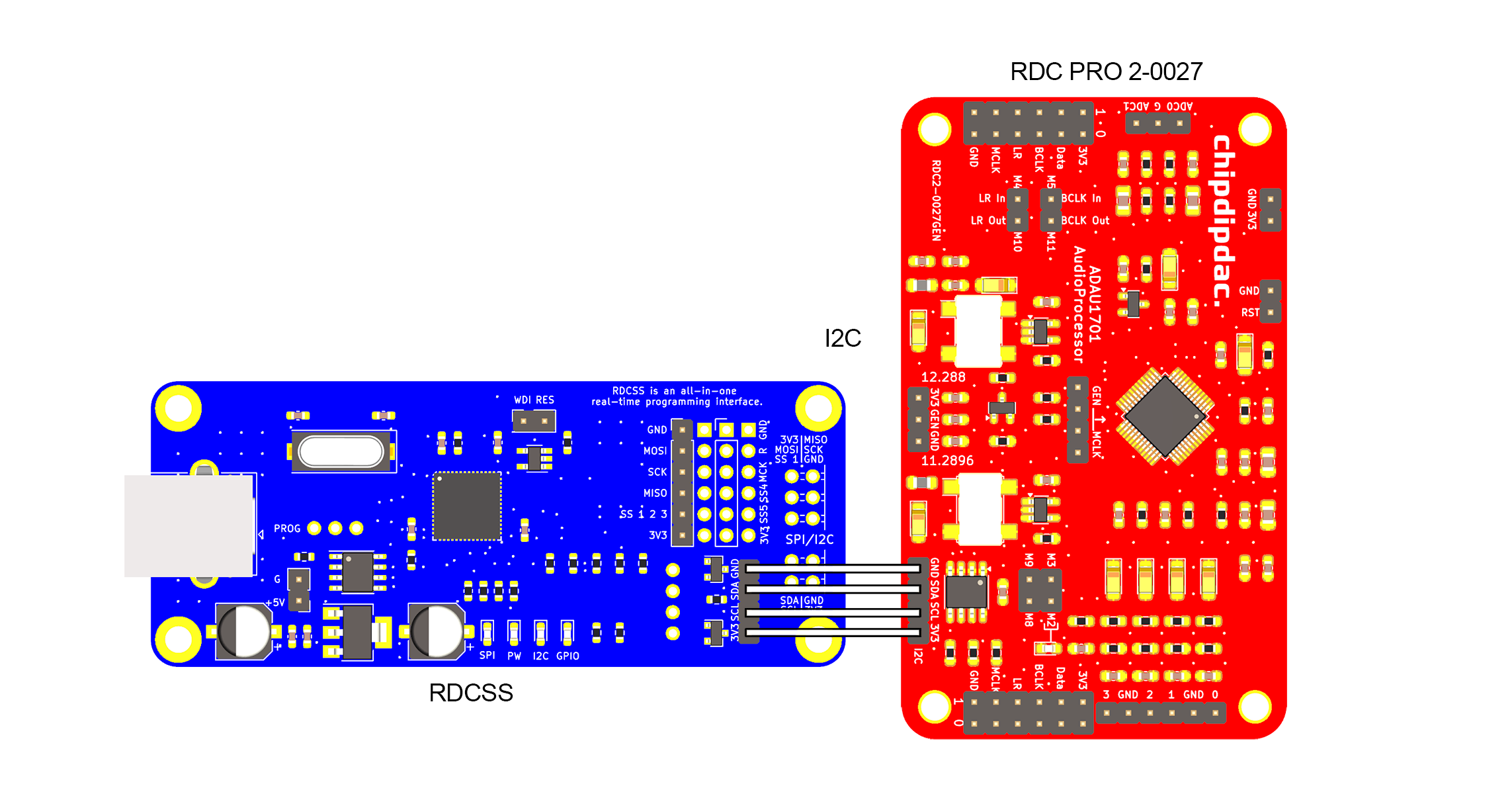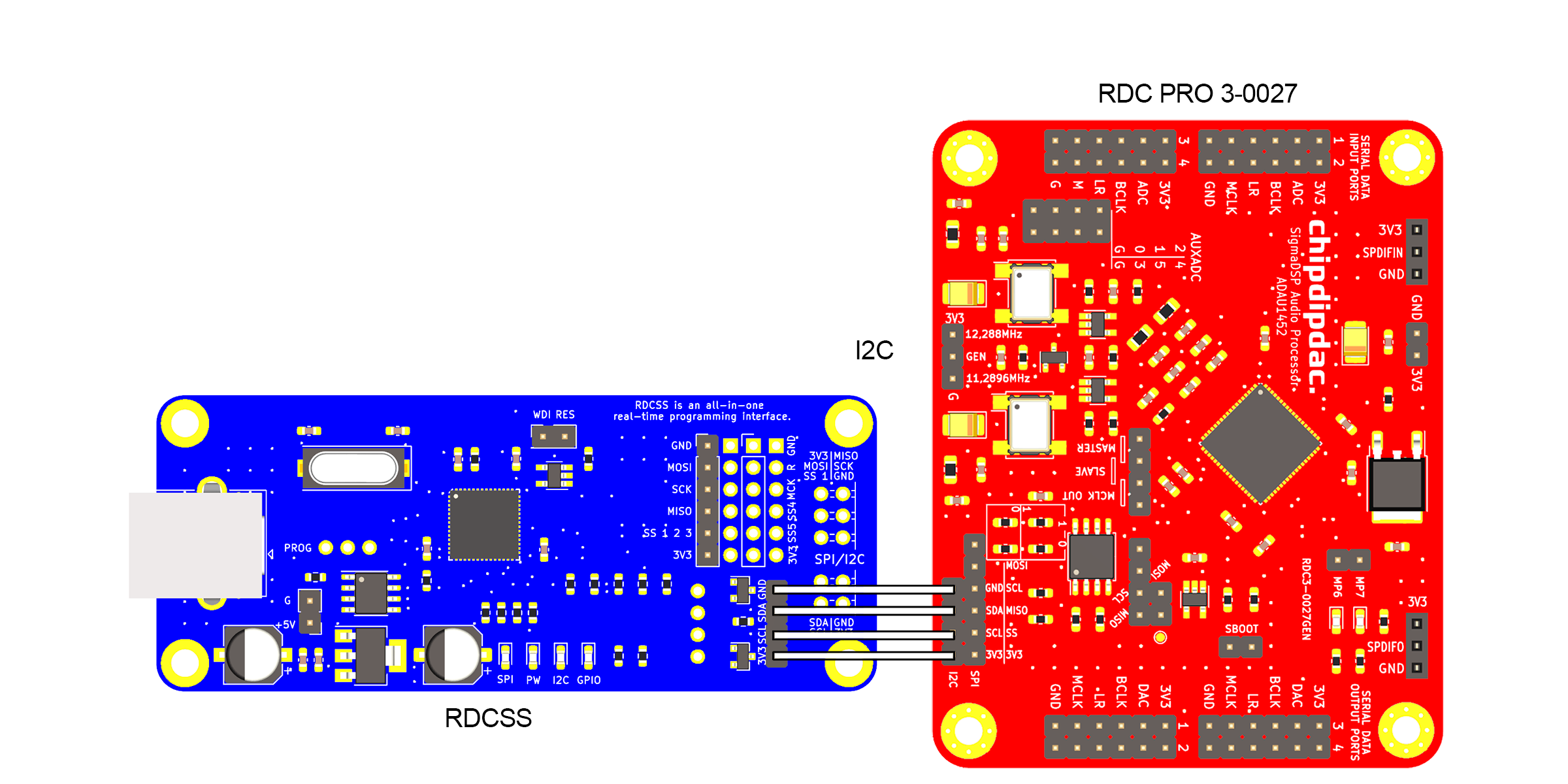 RDCSS обновленная стандартизированная версия модуля SigmaLink Представляет собой интерфейс между USB портом вашего ПК и I2C или SPI портом ввода данных SigmaDSP. Этот интерфейс может использоваться с любым аудио процессором, который поддерживается ПО SigmaStudio.